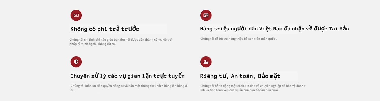 Cho dù đó là số tiền bị treo do đầu tư hoặc các vấn đề bị thao túng lừa đảo tình cảm để tống tiền qua mạng , Chúng tôi cam kết đều có thể hỗ trợ và đưa ra phương án tốt nhất để thu hồi tiền về nhanh và uy tín nhất .